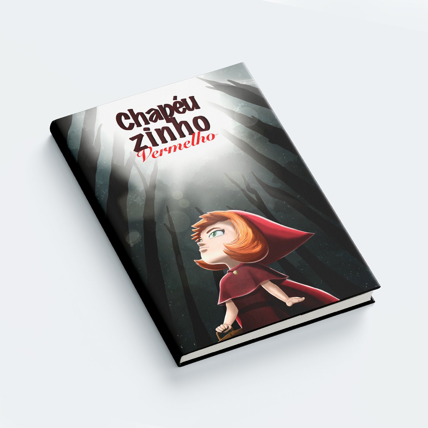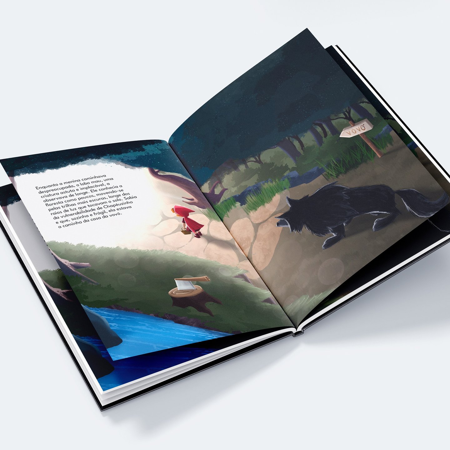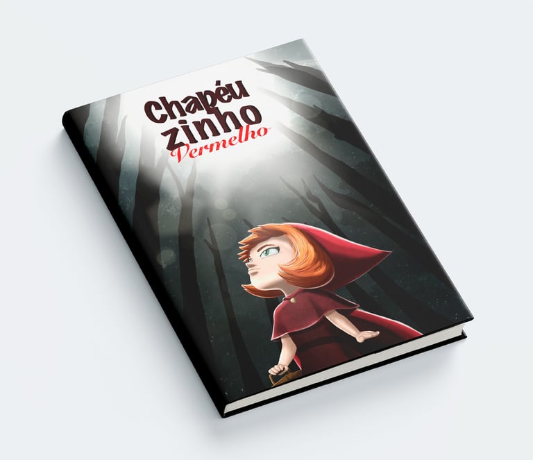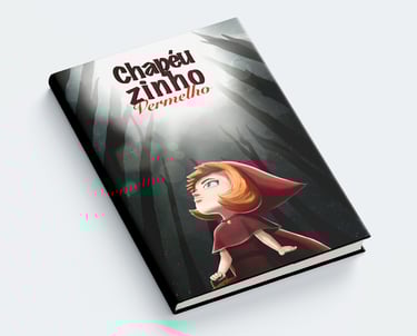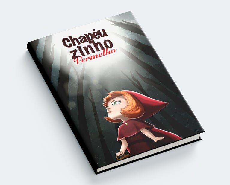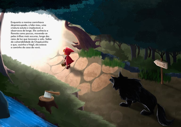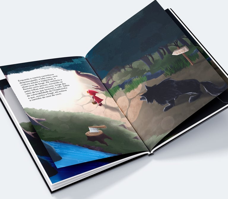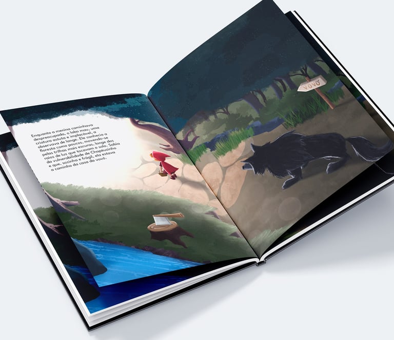Fiz uma ilustração do clássico livro infantil Chapeuzinho Vermelho. Criei uma capa com a personagem perdida na floresta e uma página dupla em perspectiva isométrica, retratando a perseguição do lobo.
