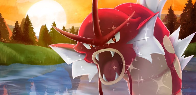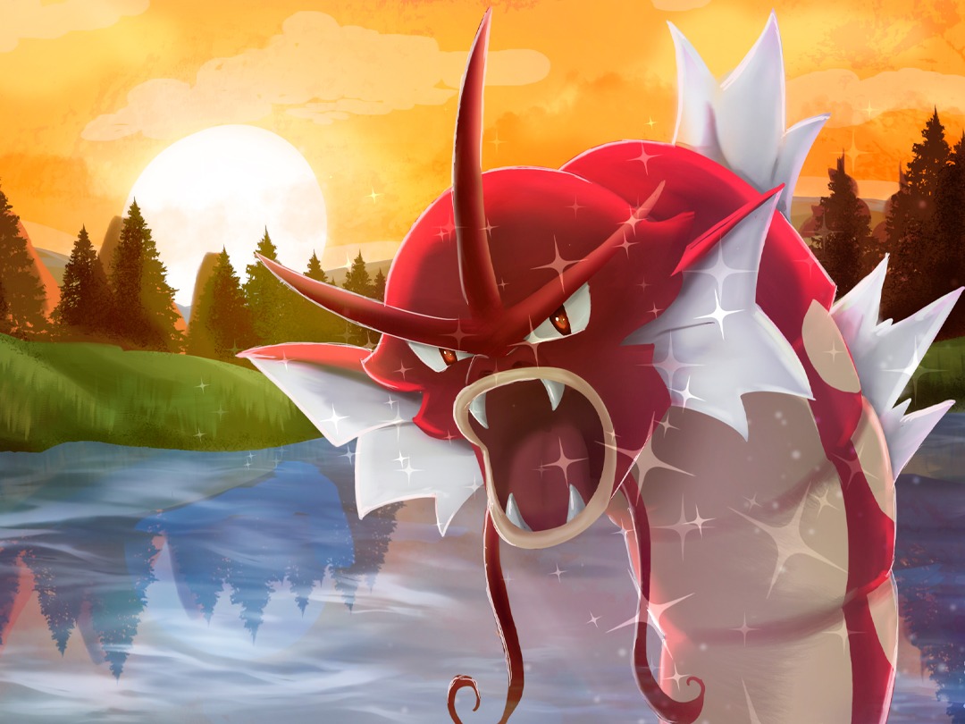This illustration portrays the iconic moment from Pokémon HeartGold/SoulSilver when we encounter the shiny Pokémon at the Lake of Rage.