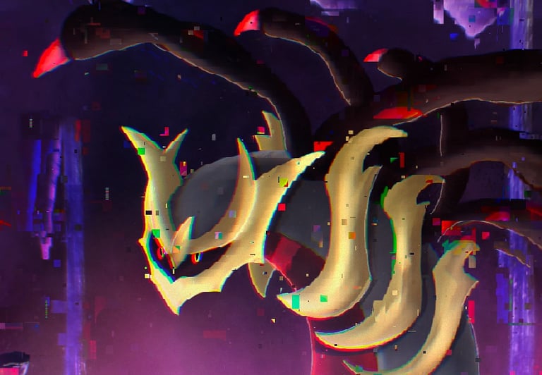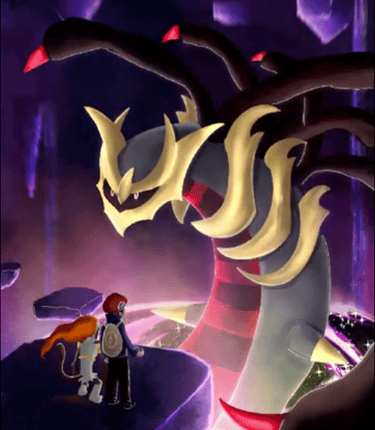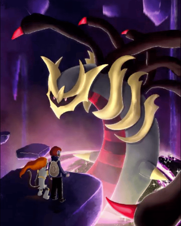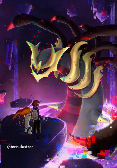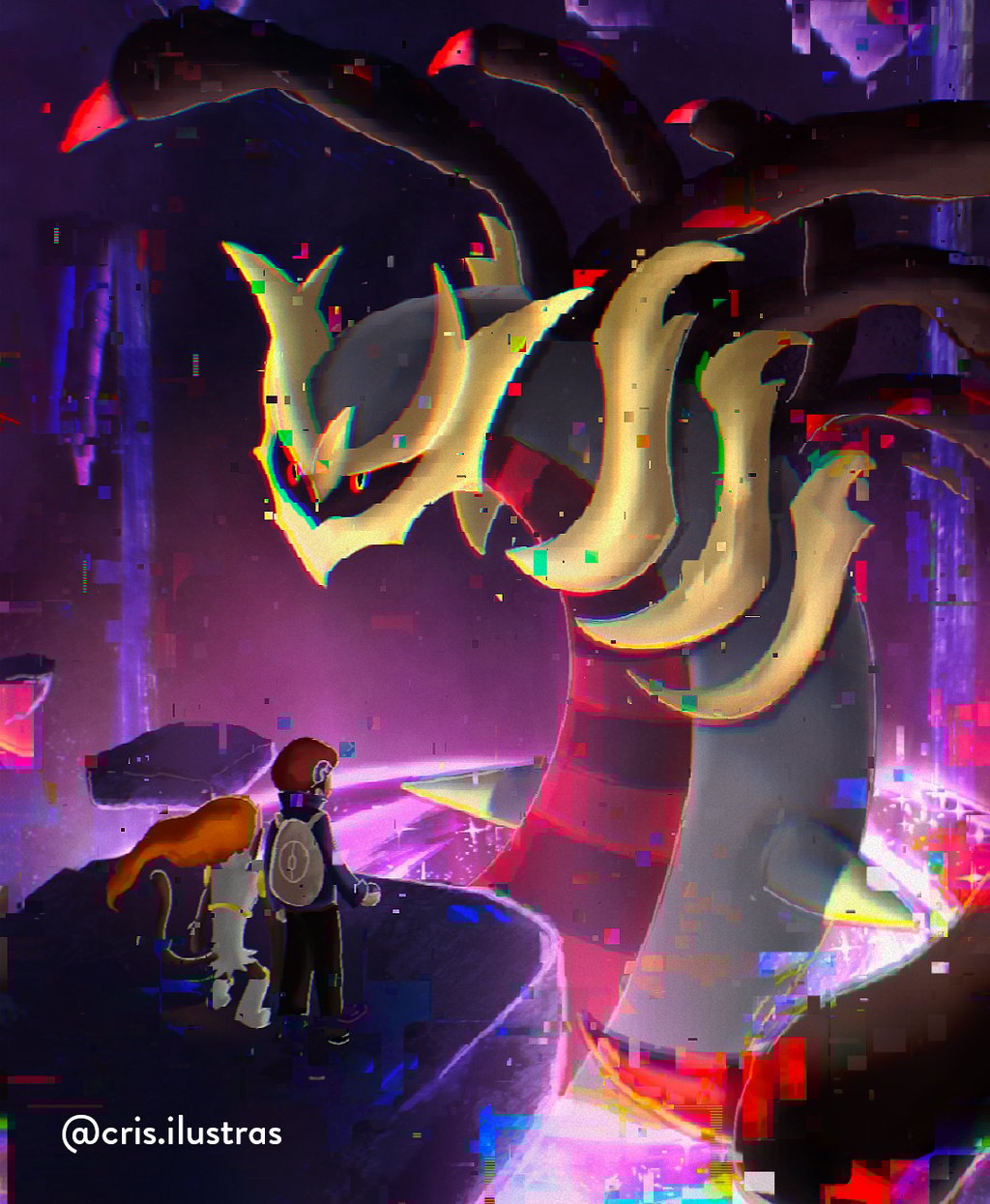 Este trabalho retrata o momento icônico de Pokémon Platinum em que percorremos o Mundo Distorcido e encontramos Giratina, o lendário Pokémon que habita esse lugar enigmático.