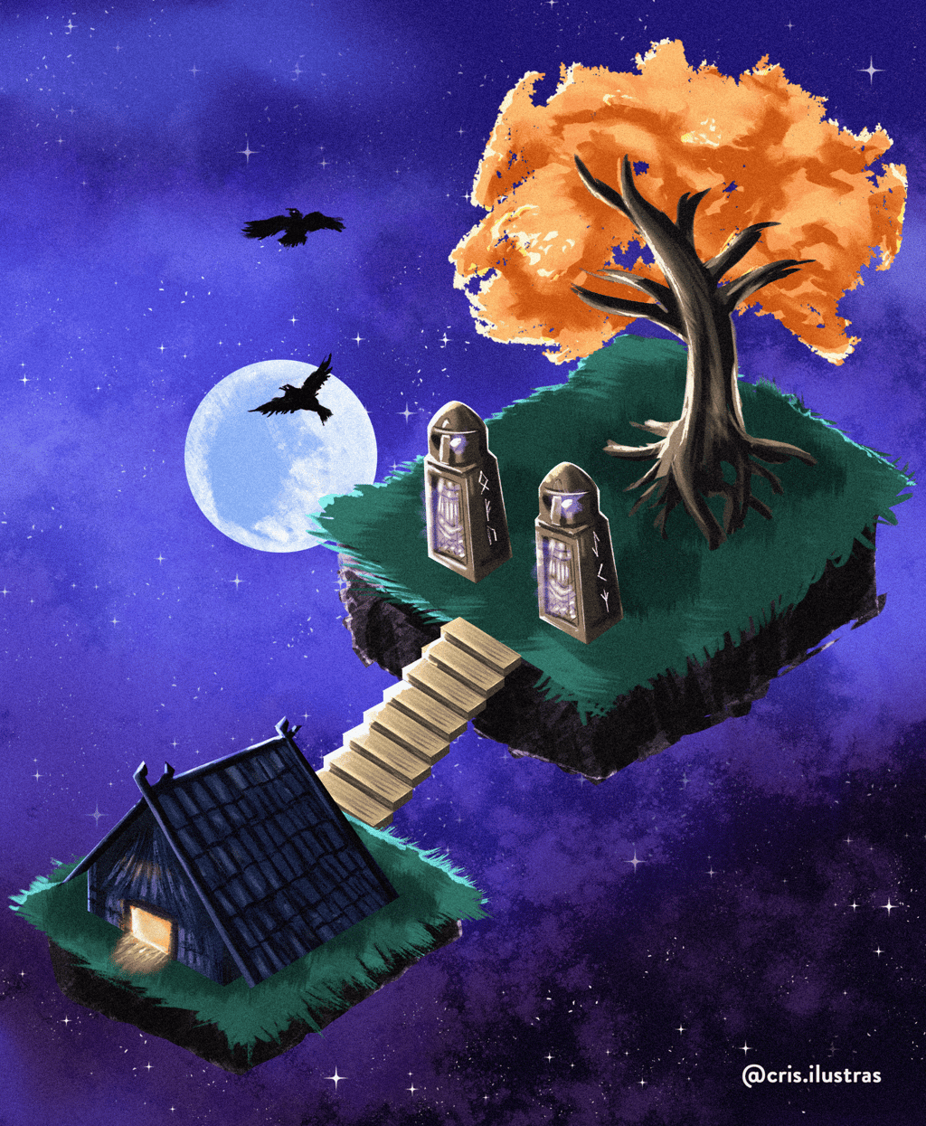 I created this isometric-perspective scene as a tribute to Norse mythology, featuring Odin’s totems and his ravens flying across a starry sky.